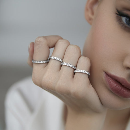 Sparkling full cut cubic zirconia and mirror-polished noble metal are available in models for the base of the finger and its upper phalanx