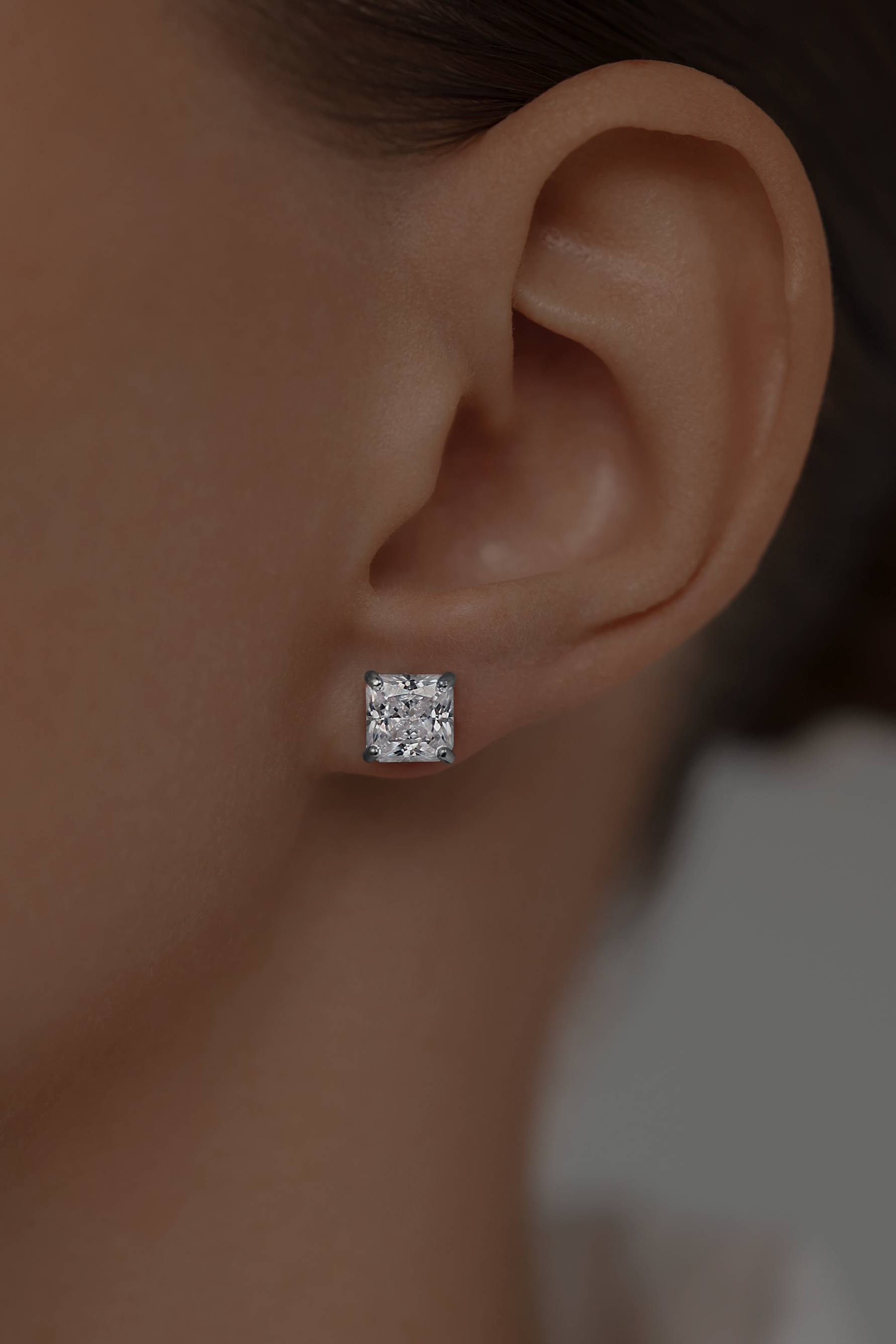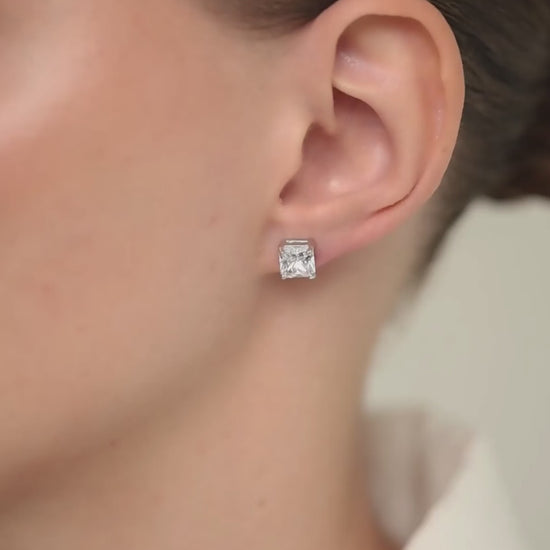 | The epitome of Old Money style. Classic cubic zirconia stud earrings featuring high-grade, 7×7 mm princess-cut stones. The secure lock is comfortable and allows you to adjust the tightness as needed. The pin is thin and neat—it won't stretch your earlobe or cause discomfort, unlike a screw-back closure. |