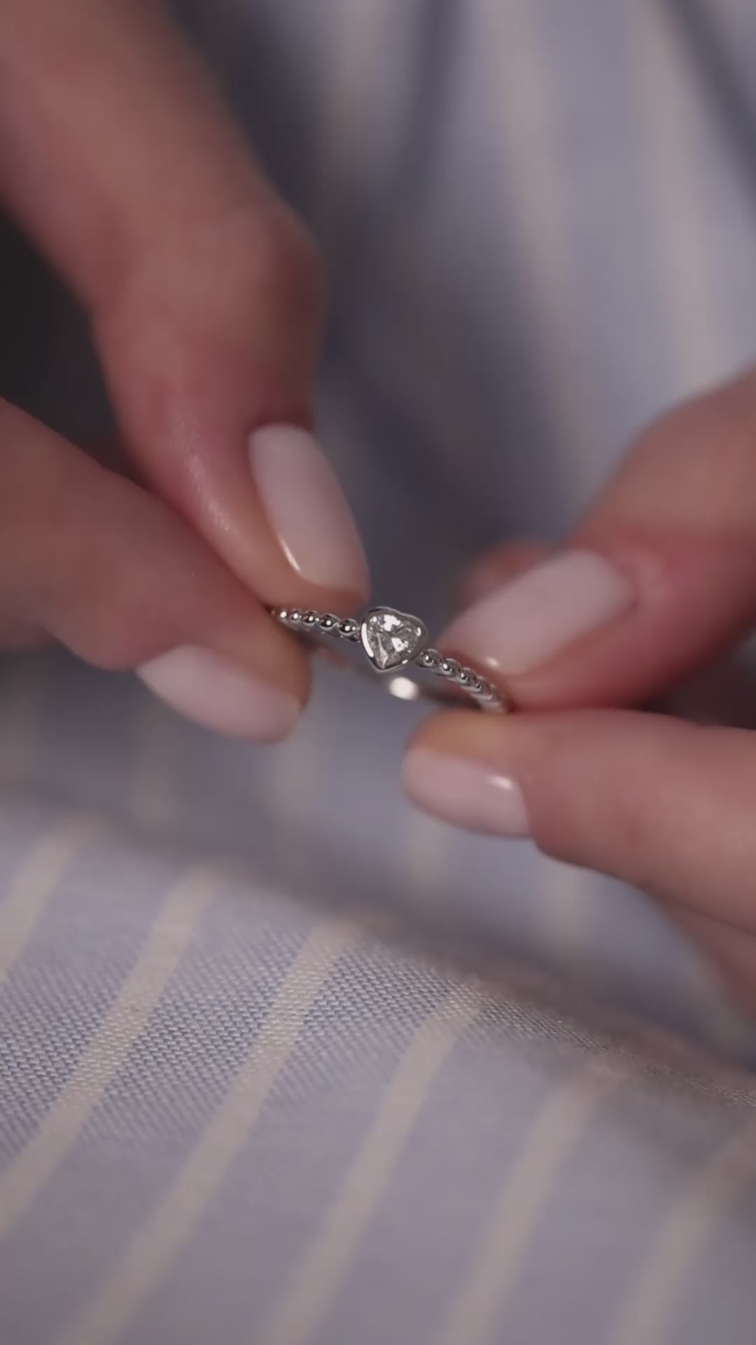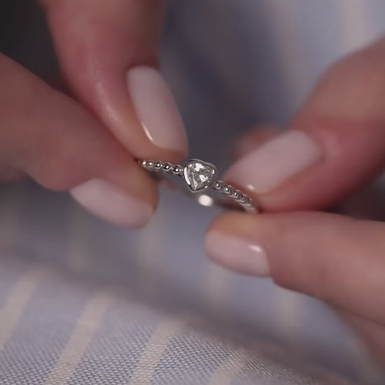 | Sometimes, you want to wear rings — lots of them, on every finger. This textured "bumpy" ring, adorned with a miniature heart-cut cubic zirconia, fits this concept perfectly. A delicate ring with a heart encapsulates love — almost like a tiny valentine that stays with a person forever. Crafted from 925 sterling silver, plated with platinum; featuring a heart-cut cubic zirconia. |